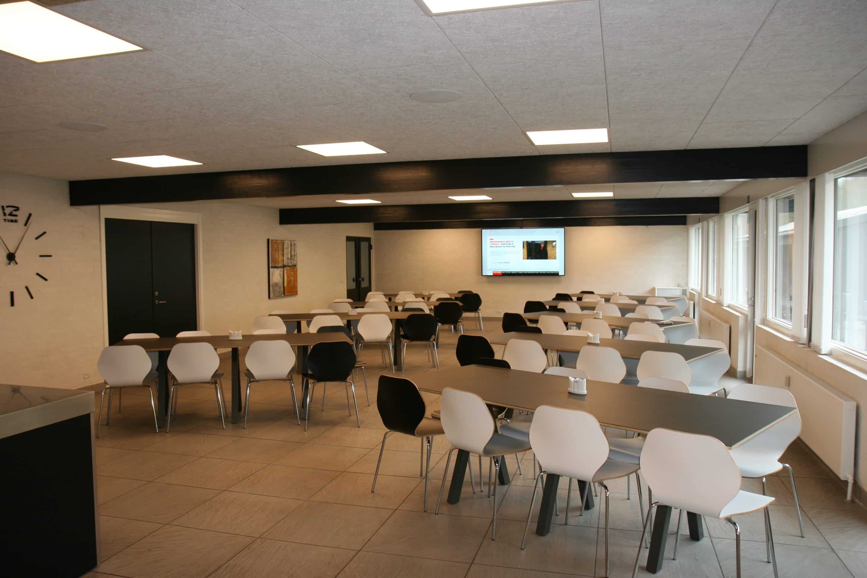 Kantinen er ikke kun det daglige samlingspunkt for frokost. Den kan også benyttes til uformelle møder, netværkssamlinger eller frokostarrangementer med gæster. Her er plads til mere end 70 personer i et lyst og moderne miljø med adgang til gårdhaven i sommerhalvåret. Mulighed for leje af højtalere og mikrofoner samt adgang til Clickshare, TV og gratis trådløst netværk.